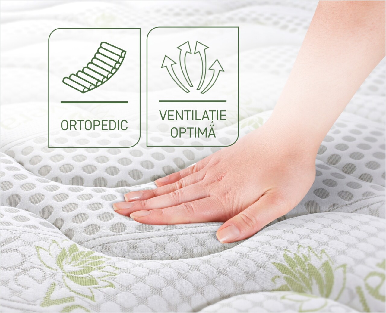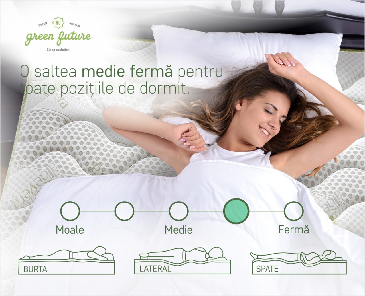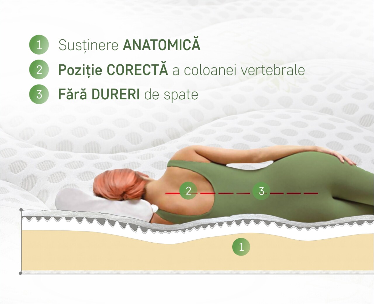 Baza saltelei din spuma elastica Green Form HD® cu celulatie deschisa asigura o sustinere anatomica a corpului si o pozitie corecta a coloanei, fara dureri de spate in timpul somnului.