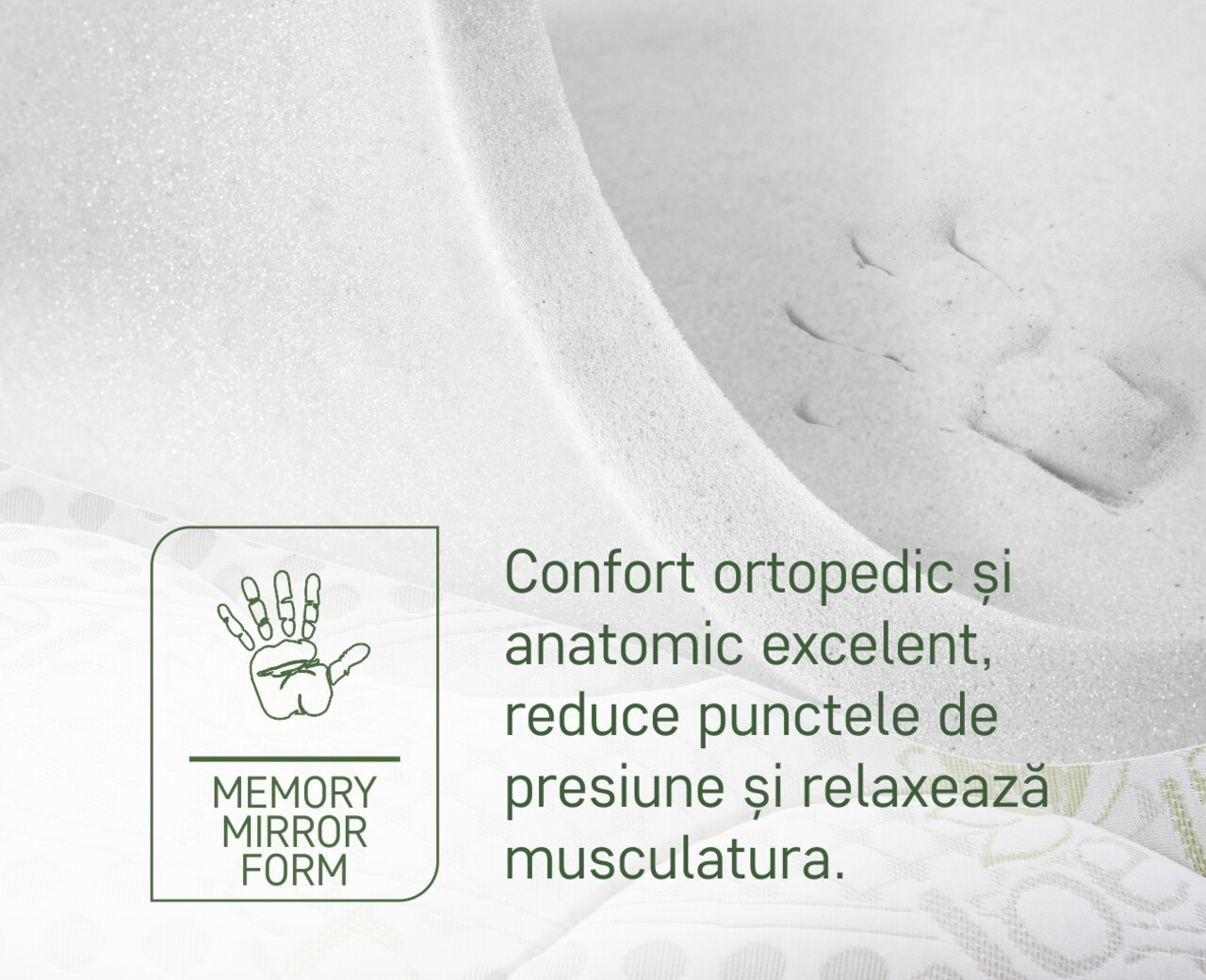 Tehnologia avansata a spumei suport Green Form HD® impreuna cu cea a stratului de Memory Mirror Form® asigura un somn fara propagarea miscarilor partenerului.