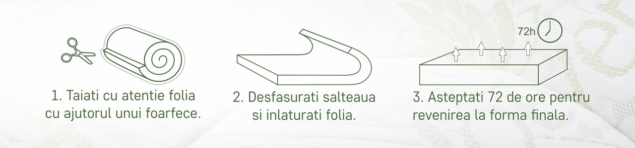 - desfaceti cu grija ambalajul si folia de protectie, fara a folosi cutitul sau alte obiecte taioase care ar putea deterioara tesatura saltelei.