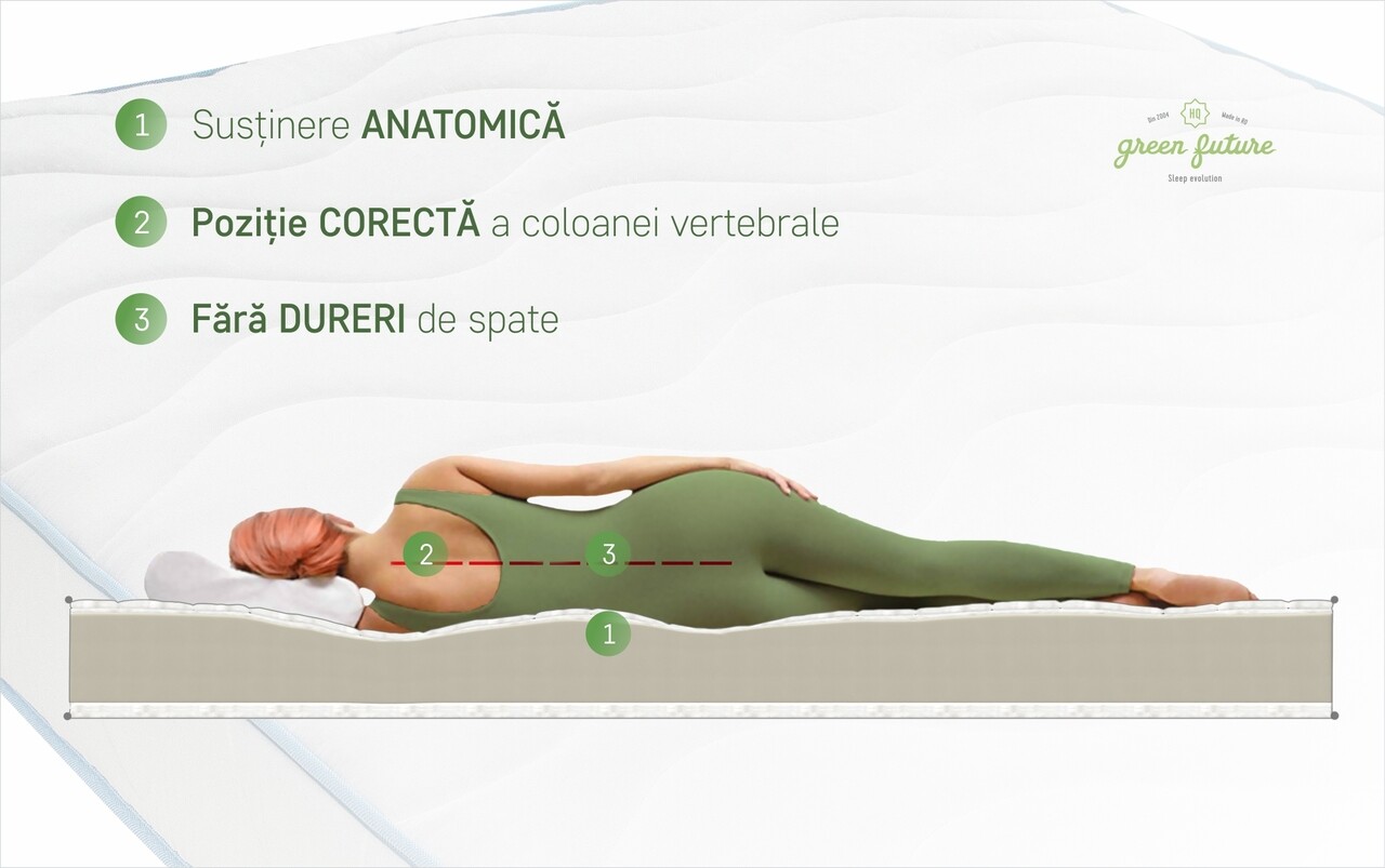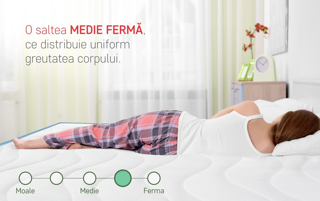 Este o saltea recomandata pentru toate pozitiile de dormit: pe spate, pe lateral si pe stomac.