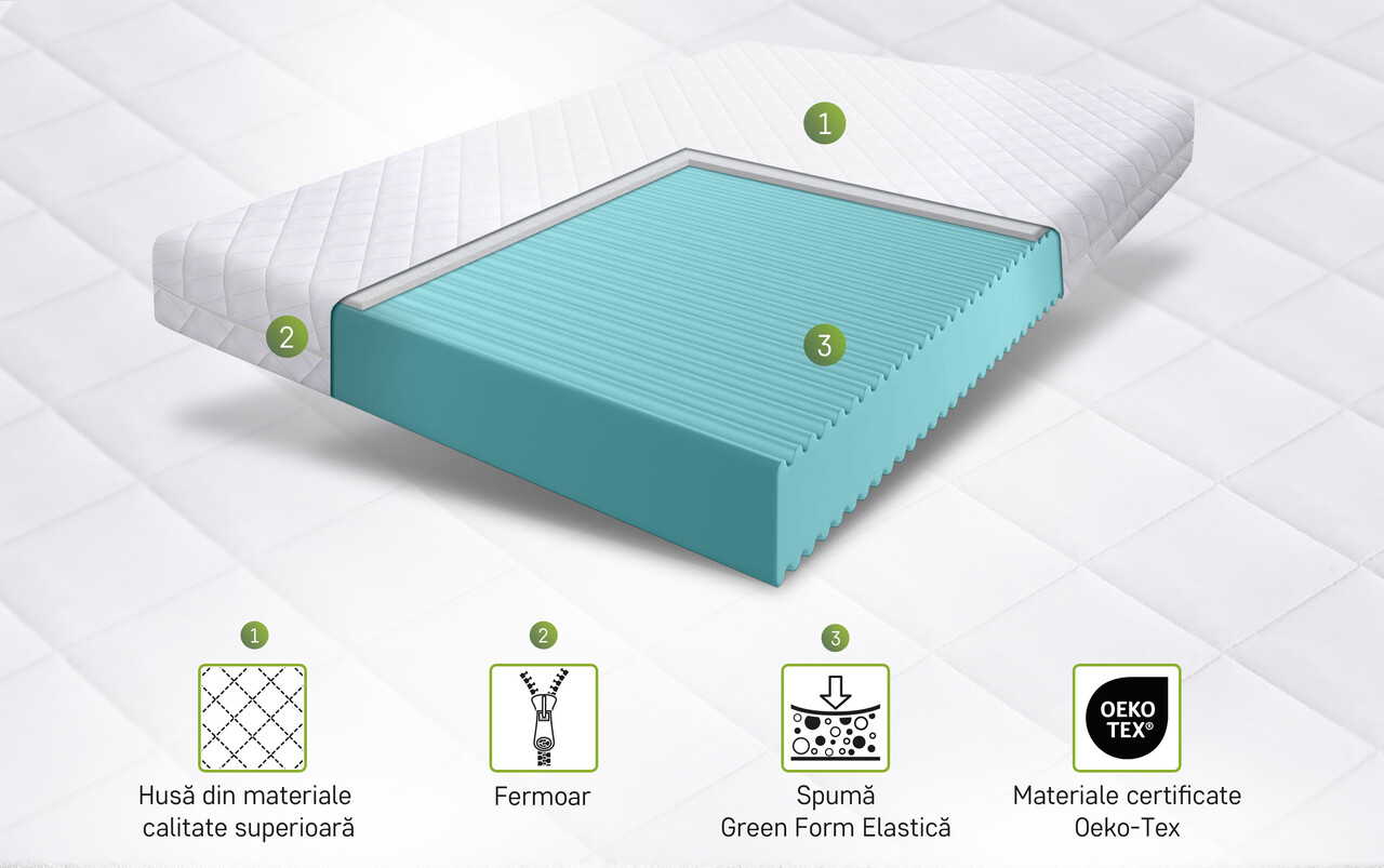 Saltea SuperOrtopedica Green Future KONFORTA Max Plus 25 cm, 90x200x25cm, Spuma poliuretanica elastica, Husa detasabila, lavabila, matlasata, hipoalergenica, Reversibila, Medie Ferma