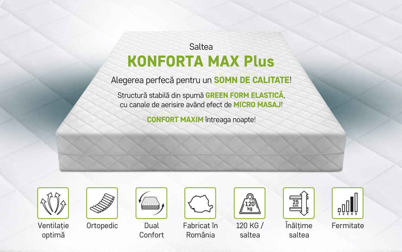 KONFORTA MAX PLUS este o saltea super-ortopedica, cu o fermitate mediu ferma H3, gandita sa imbine sustinerea optima cu un confort exceptional si o ergonomie perfect adaptata corpului. Suporta o greutate de pana la 120 kg/persoana, oferind stabilitate si sustinere pe termen lung. Este reversibila – poate fi folosita pe ambele fete, ceea ce ii prelungeste durata de viata si mentine calitatile saltelei in timp.